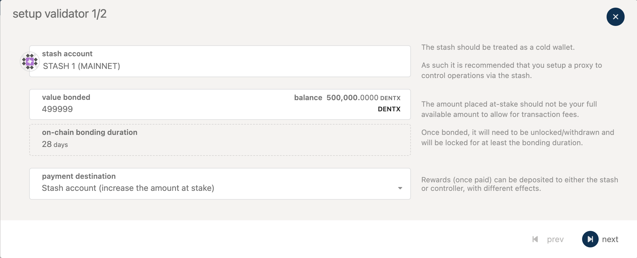 The Validator UI is based on PolkadotJS. It can be accessed at https://main.dentnet.io/polkadotjs.
